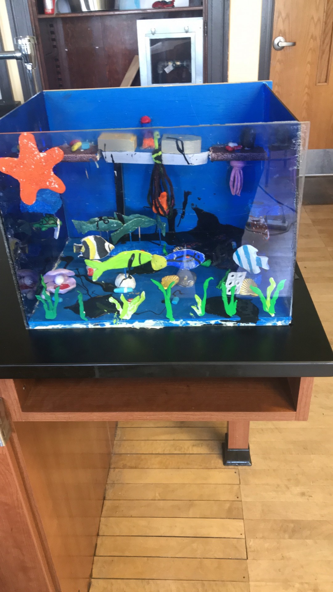 In my art work there are many different colors used to represent things. The bottom of the work has like a brown mass that is supposed to represent water. Then there are pink type clouds that has a mountain structure in the middle of it. There is also this blue wind sweeping over the mountain. The sun is a blue circular figure to the side in the corner. I want the work to communicate whatever the person feels looking at it. The wind, ocean, sun and mountain can represent different things to a person while looking at it. For the painting I used a block of wood as my canvas. I used tempera paint, newspaper and acrylic paint. The tempera paint was used for like everything and layered of the newspaper for part of the ocean and the sun. The acrylic paint was used to make “snow” on top of the mountain and used to add some white details in the ocean. My current work is like my previous work because both of them are like whimsical in a way. In both works nothing is supposed to be the color that it is. The process involved for my work first started off with me making an outline on the wood for what I wanted the painting to look like. As i began painting with the outline I quickly realized I did not like and another vision popped into my head. So I started off with painting the ocean and the mountain was a leftover thing from my previous vision. So I added a sun using newspaper for texture.