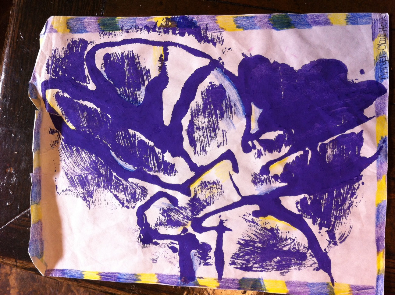 For this piece of Art, I used texture. I created texture by adding string to the artwork before I painted over it. I put string and many different other unique things and then painted and printed the object on the paper. I used color by using colors close to purple and colors that would bring purple out, Like yellow. I also used the white background to make the purple stand out more.