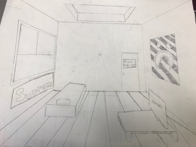 I drew a bedroom from a one-point perspective meaning the drawing is directly facing the front. I learned that there are many different objects you can draw in one- point perspective. I also learned that when you draw in one point perspective you have to make sure your lines are precise because if they are not then your object won't come out the way you want it. I am most proud of the wall in my drawing because it's colorful and meaningful to me. I wish I could improve the neatness of my lines. One tip I have for someone doing this project next year is to pay attention.
