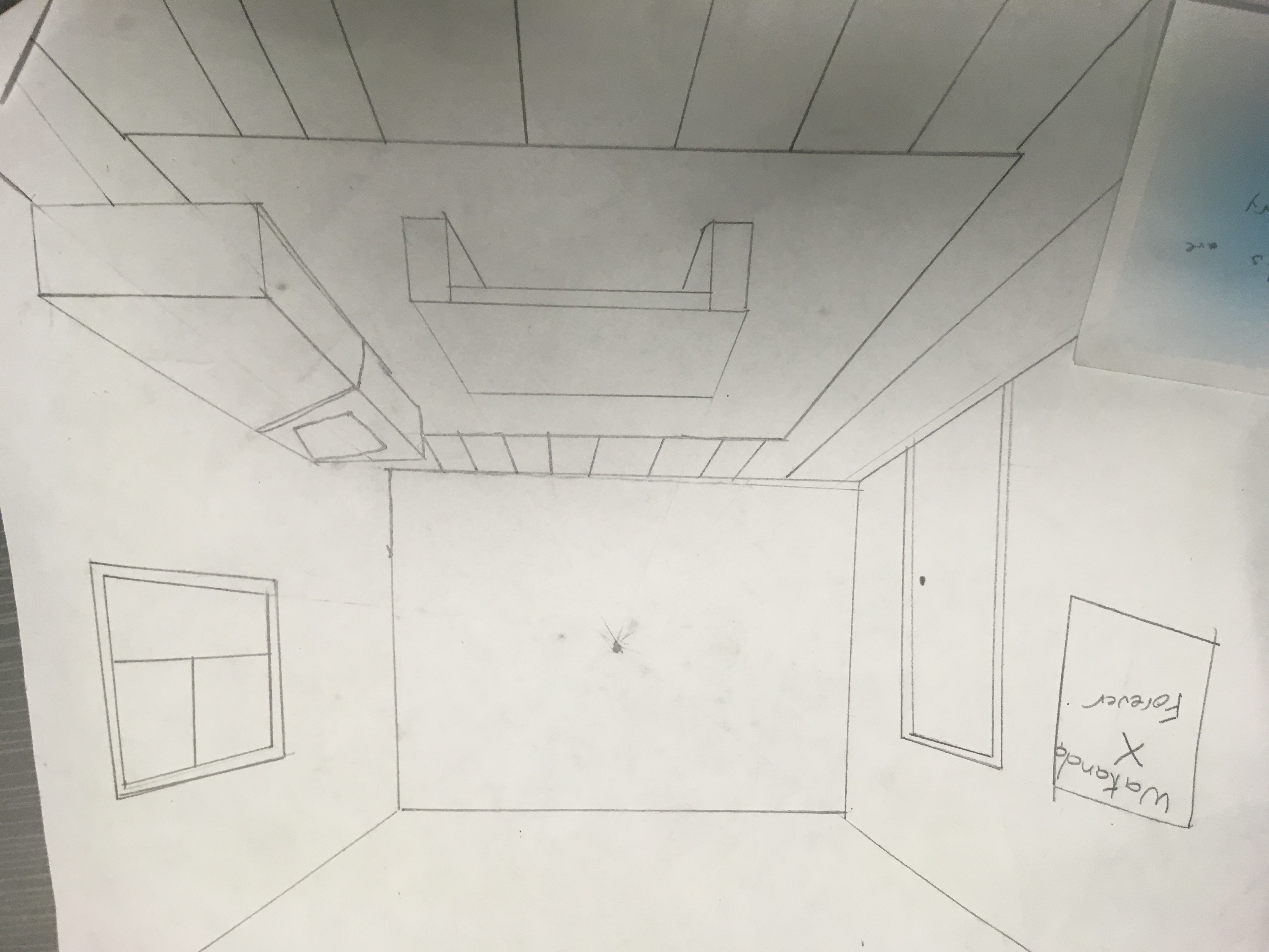 I drew a room it had four doors a bed with some sheets a table rug wooden floor hole in the ceiling and window. that sometimes drawing lines to the point sucks. i am most proud of finishing this. I wish I could make my lines straighter. one tip is to not do it because you wont have to improve if you never did anything.