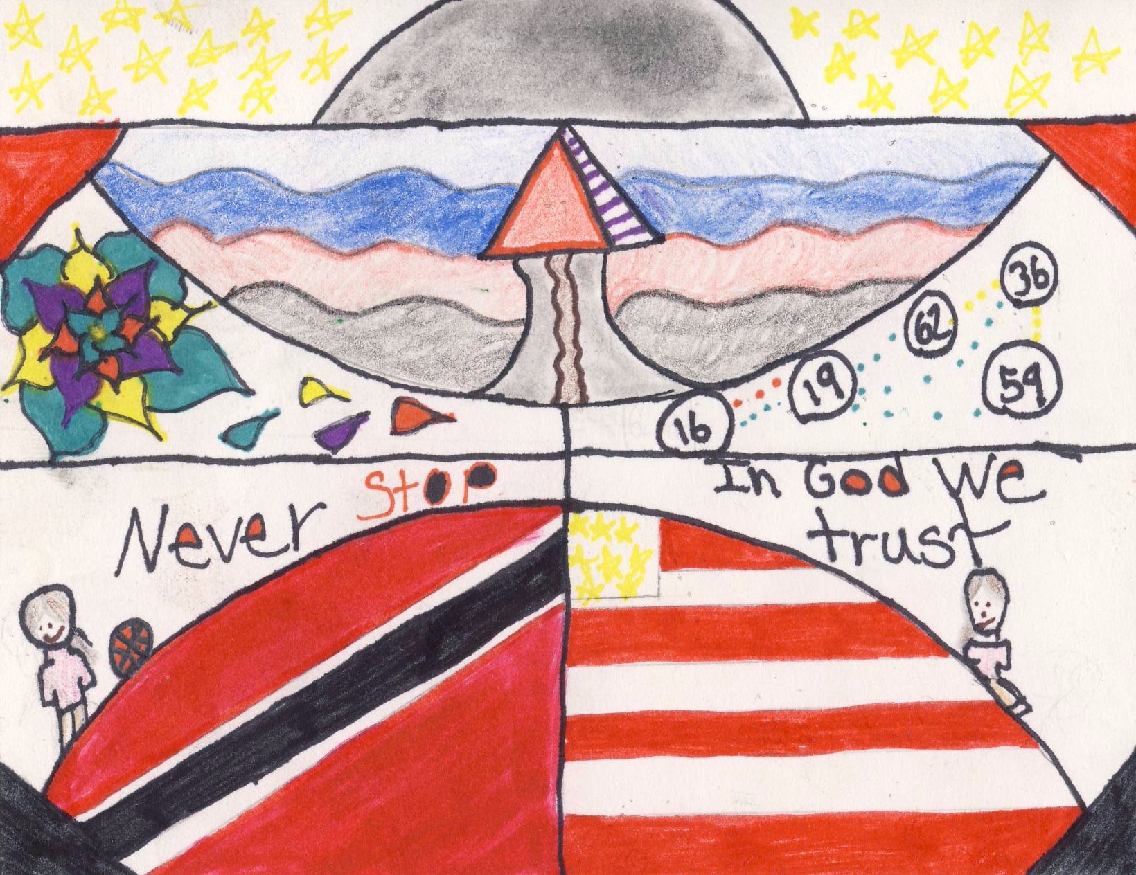 To Begin, I love basketball. I believe basketball is my overall goal. To me, basketball is the moon. I draw an outline of a basketball court. You can only see it when you turn my picture sideways and actually look to understand. Next, I cut off four corners and color them in. The two top corners are red. Making the bottom two black. My first half of the picture are two flags. The first one is the flag of Trinidad and Tobago. This is where my family originally came from. The second one, the United States of America flag. Where I was born and lived my whole life. The two flags are more like a round shape because of my basketball imertagry. There is a girl on each side of both flags. To represent me. One is me with and basketball. With the words “Never Stop”. Next One is me without a basketball. With the words “In god we trust”. Now passing the half court line. Over the first flag. I have a flower with bright colors. With about four pedals slowly falling off. On the other side, I have five circles with the numbers sixteen, nineteen, sixty-two, thirty-six, and fifty-nine. With dotted line connecting them. On top of the two parts. Is an round shape from corner to corner just like the flags at the bottom. Showing waves in different colors. With a pathway with a triangle pointing up with steps on the side on it. In the middle of the waves. Then I draw a line over the top of that. With a drawing of the moon and stars around the moon.