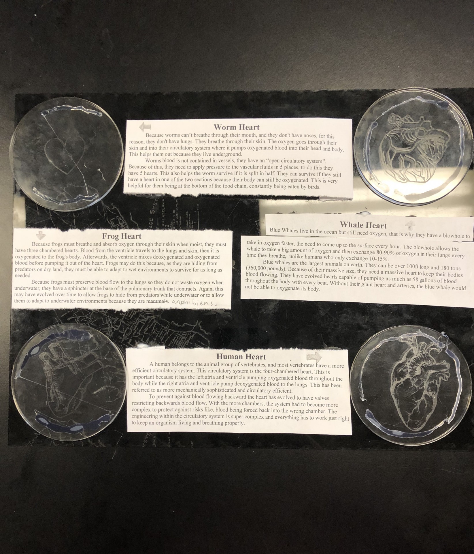 For this benchmark, my group and I studied the comparative anatomies of a worm, frog, human, and whale. To be more specific, we studied their circulatory systems and how they've evolved over time, as well as how that evolving has affected things such as selective pressures. Though they were all very different, they had many similarities in specific categories. For example, they all obtained some of the same genes, parts of their circulatory systems, etc. We found that their circulatory system adapted as time progressed and environments changed. For example, frogs must have three-chamber hearts to breathe underwater. This would be beneficial for them while hiding from predators. A lot of things can be learned about environments, nature, as well as how animals modify themselves to survive. LINK TO THE GROUP'S RESPONSES: https://docs.google.com/document/d/1zlNxYzO2FN_GsS_PSySQrG2zS2VCzm57iP6ggb4aTFk/edit?usp=sharing