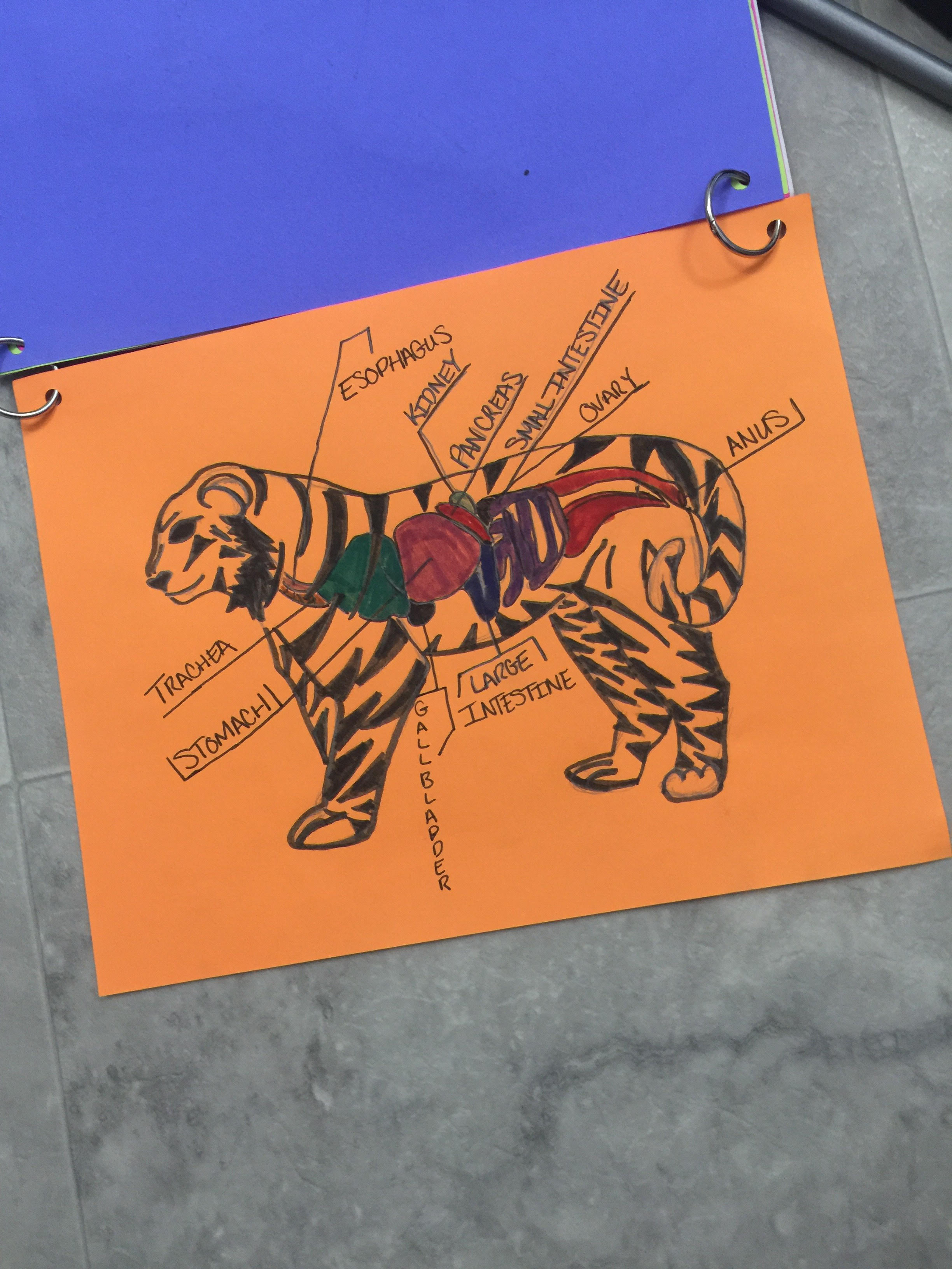 For the biochem project, we had to dissect a frog and a worm then we had to make a project about how humans, frogs, and worms are similar and different. In my group, it was Layla, Dale, and Bella. Then we had to pick another animal and we chose a tiger. In our project, we chose to do the digestive system and tell how it worked and what we did. We found out that we have more things in common with worms, frogs, and tigers than we thought we did. Here are some pictures of my project.