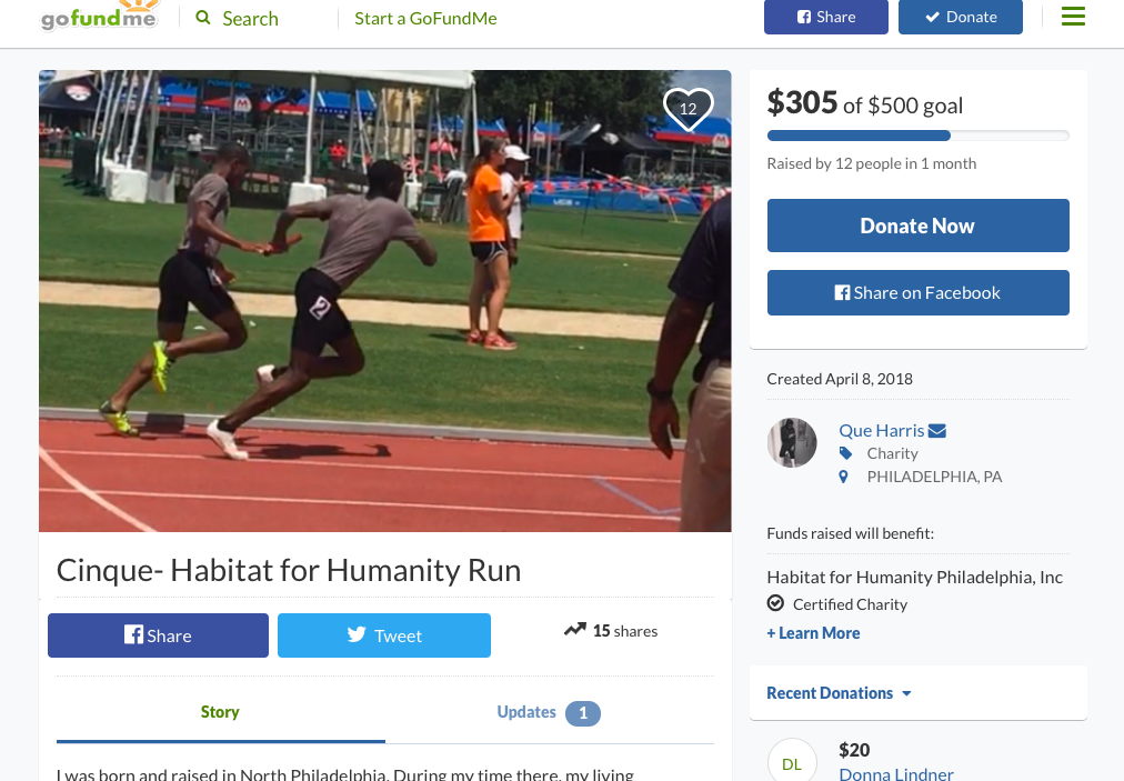 For my end of the year, senior project, I decided to raise money for Habitat For Humanity Organization. Typical when walking throughout parts of Philadelphia, (whether downtown or in urban areas) it is likely you will see people without shelter and living on the street. This is something that has stood out to me since I have born and raised in areas where seeing this unfortunate circumstance, was unavoidable. To think that whether tragedies or snow storms we may see as beautiful, may very well cause death of those without home to escape to is torturing to think about. Just because the situation I live through may be better, shows I should extend a helping hand to others of less opportunity. Through my capstone opportunity, I broadcast my care by trying to raise $500 to Habit For Humanity. The GoFundMe page I have created has so far raised $305 in several weeks and I hope to continue growing towards my goal. To provide more of my passion I will also run a five-kilometer race to symbolize the distance of effort that homeless have went through.