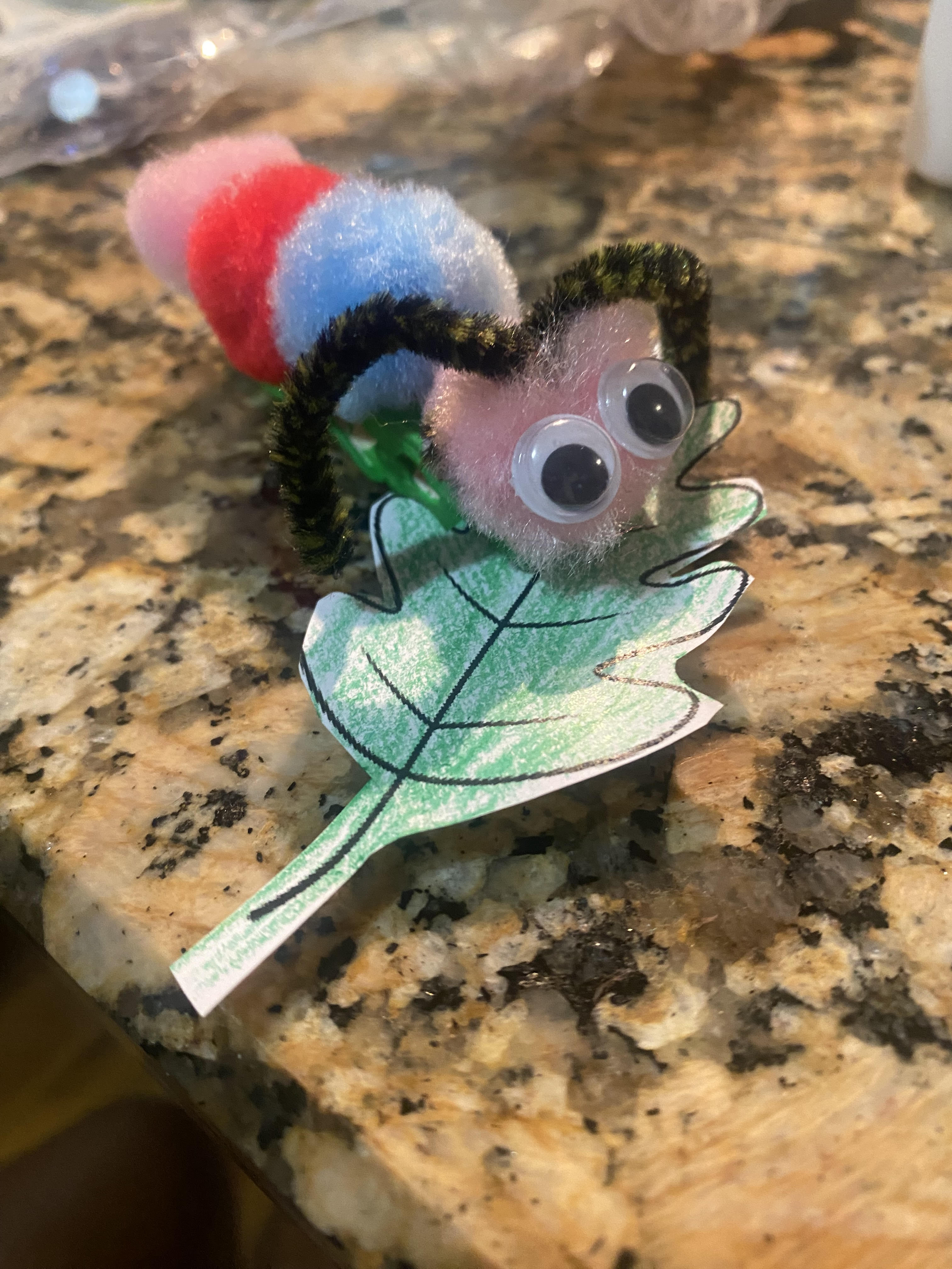 Before the craft, I read the book, “From Caterpillar to Butterfly” by Deborah Helligman. For the actual arts and crafts portion, I led them through a craft of making caterpillars from pom poms and clothespins. An example is below.