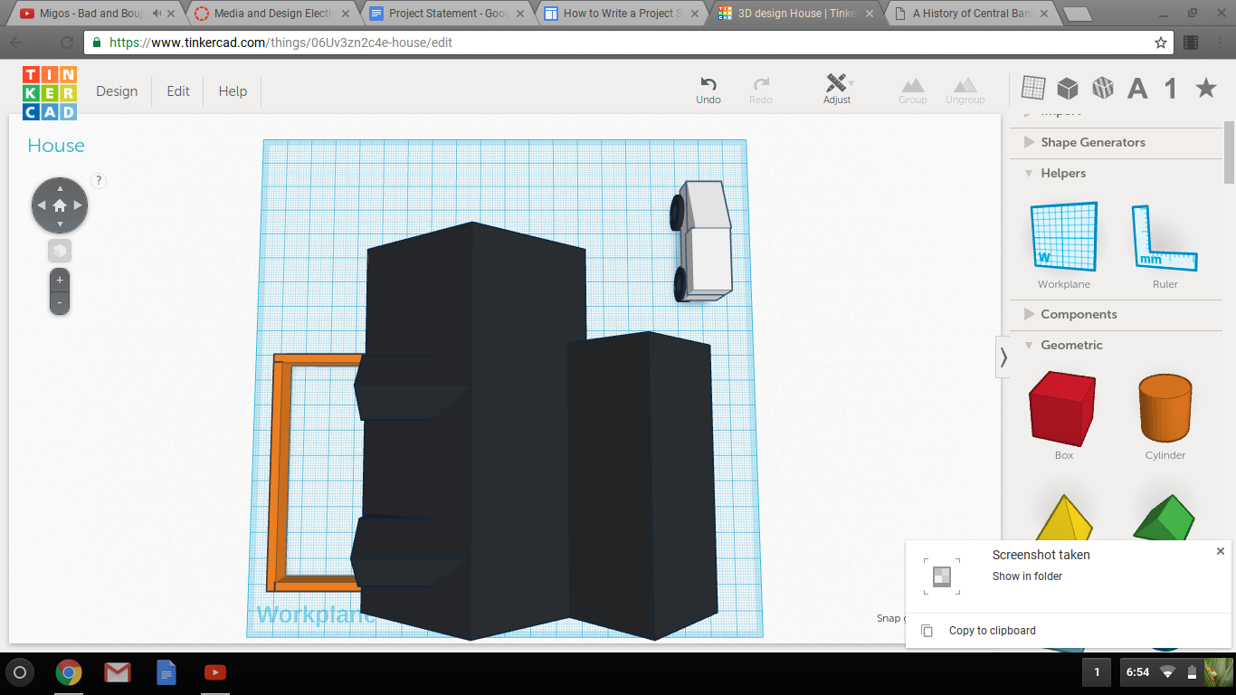 My 3D project shows a home. I decided to design that because I feel as though that is where everyone feels or should feel comfortable there. Houses come in many different designs but I chose this one because I like the way it looks. At first, I had to figure out how to use Tinkercad and it’s different tools. I was required to complete three lessons that was given to me on the Tinkercad website. One of my failures was scaling the car and garage. The car was way too big to ever fit in the garage so I had to make the car smaller. I didn’t have any other failures, other things were tweaks to make the design look better. I learned that making a design on any website or designing program is not simple. There is a lot of measuring and you can never make your design perfect on your first try. You will need to edit and tweak some things to make it look nice in your eyes and other people’s eyes. I learned that I tend to not try my hardest when I think a project is simple or not complex. I misunderstood the level of difficulty of this project and didn’t try my best with the design or with the process of this project. I would spend more time actually perfecting the design if I was able to re-do this project. That would give me the time to be more creative with my design and make it look way better. I would advise that no one should underestimate this project, especially if you are working on 3D modeling. This project didn’t give me any inspiration, it just showed me what it’s like to work on a project that has to do with computer modelling. This tool let me show visually that you should always feel comfortable at home or know that there is no place like home. I designed a home so the thought of someone being comfortable at their own home. Hopefully this inspired them to design their very own house and whenever they need to make themselves feel comfortable, they look at their design.