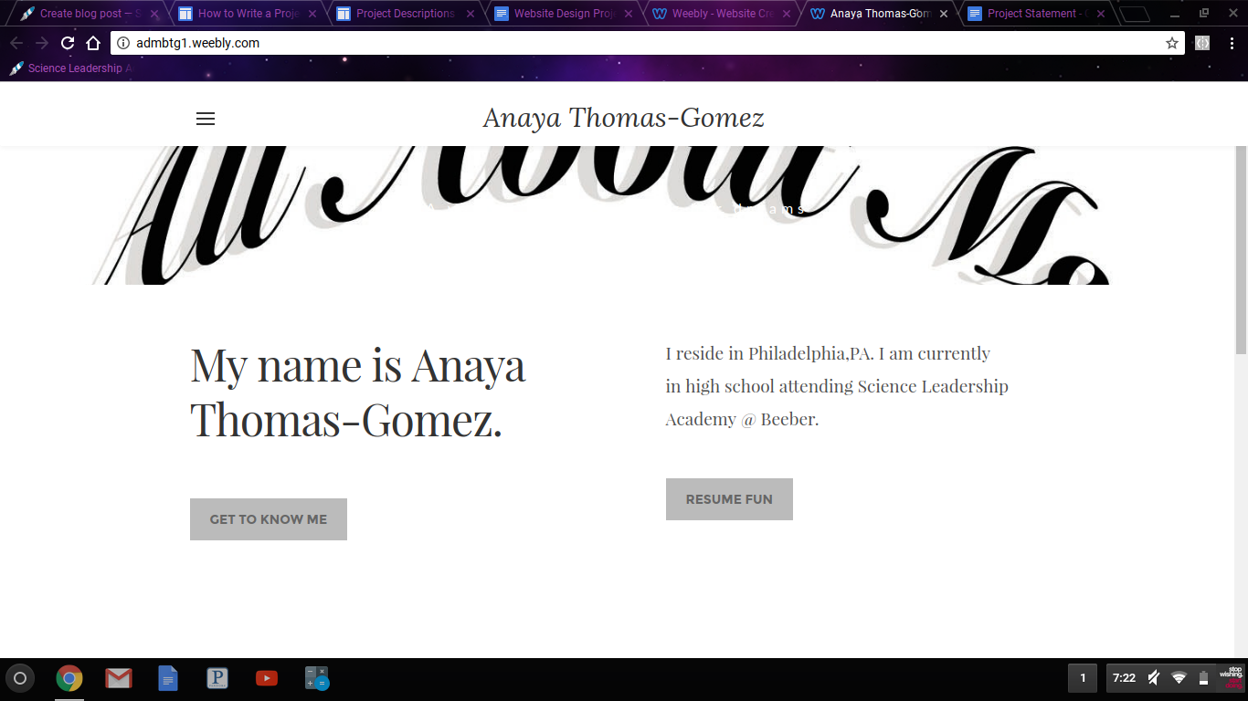 For my media and design class I was responsible for making a website. This website was to basically be a source which can tell you about myself. During the process of creating this website, my teacher broke down each part of the website into checkpoints. For this project I made sure that I met all of the requirements that each checkpoint needed. When making this website I was unsure on how exactly a website is supposed to be creating. I had to try so many buttons on the website maker just to see what I wanted to use. A big problem I had was figuring out how to turn a blank page into a page of my own. Due to me doing this project I learned that I can do whatever I want as long as I put effort into it. I learned this because when in media and design class I would look at others progress and compare our projects. When I noticed something that they did well but didn’t know how to do it I pushed myself into figuring out how to get it done. If I did this project over again I would use my class time more wisely. Since I played a sport a missed class some days so I should've just got to work instead of communicating with others. If you plan on doing this project in the future I would suggestion having an idea of the theme you would like to use. Having this in mind will give you a better image in your head. This project inspired me to build a website for someone I know who owns a business.