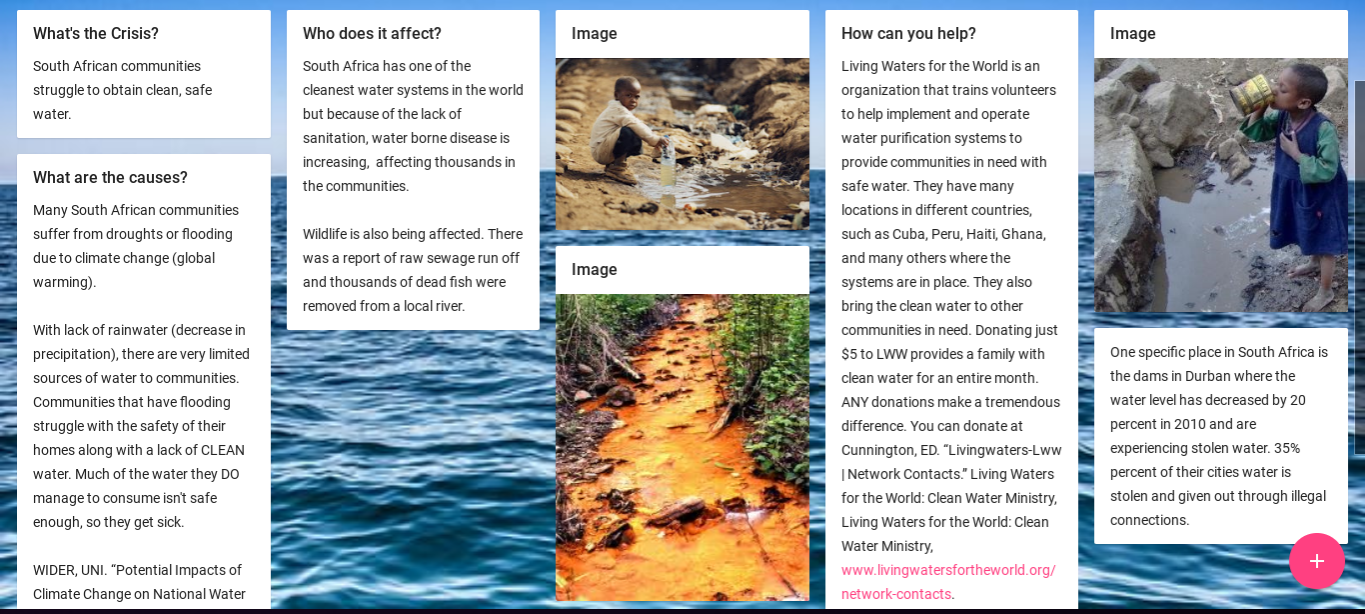 What stood out to me during my research was the simple fact that small places such as counties will not have access to good water. Once they begin to speak up and ask for a change they have deal with spending more money on water bills when their water is already affected.
