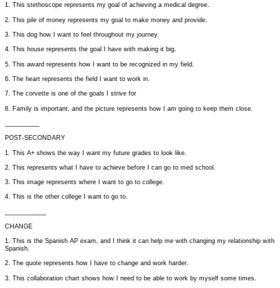This is my vision board, and it shows you a lot of things about myself. It shows you how I want to change myself throughout life. It shows you what are my plans after I leave high school. Finally, It shows you what the career goals that I want to achieve.