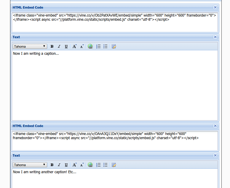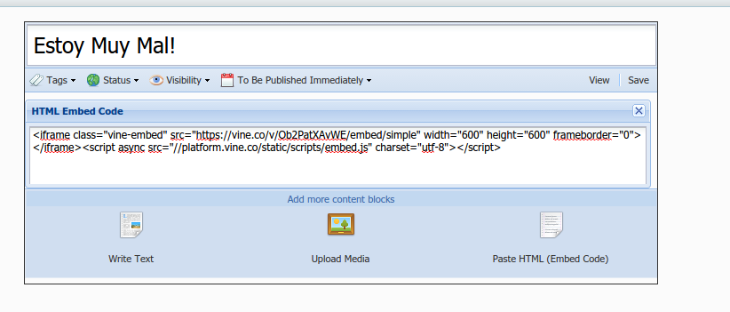 5. Back on your blog, click the "paste HTML (embed code)" button, then paste the embed code from vine right there.