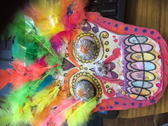 I decided to create a sugar skull in remembrance of her because I miss her dearly. Since, “Día de los Muertos” is the holiday of celebrating the dead and my Aunt Rosa loved to celebrate and party I figured she would be the best person to use for my sugar skull. My sugar skull reflects her because it has her favorite color red incorporated in it. In addition, it’s very colorful because as I said before she was vibrant and outgoing.  I added feathers to show how elegant and ladylike she was. Glitter and jewel pieces were added to demonstrate how she loved to be bold with the way she dressed and her makeup. Also, how she liked sparkly items. I added a sign saying Queen Bee because she was the queen of my heart. My mask has a similar look to my skull. My mask only has more light colors incorporated in it. I chose to add more feather to my mask because I wanted a 1950’s theme, which reminded me of the pearl necklace she gave me. Women of the 1950s tended to wear head pieces with lots of feathers and since, I didn’t have any pearl charms that’s the only thing I could use.